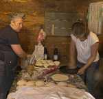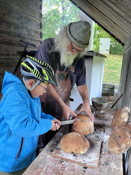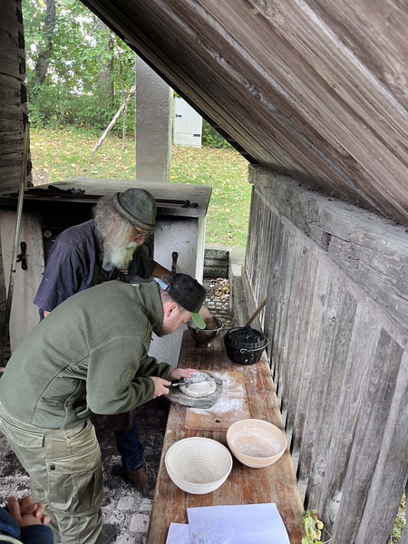 Reinhard heizte den historischen Backofen auf und man konnte seine eigenen mitgebrachten Brotlaibe einschießen oder sich bei der gemeinsamen Vorbereitung des Sauerteigs beteiligen.