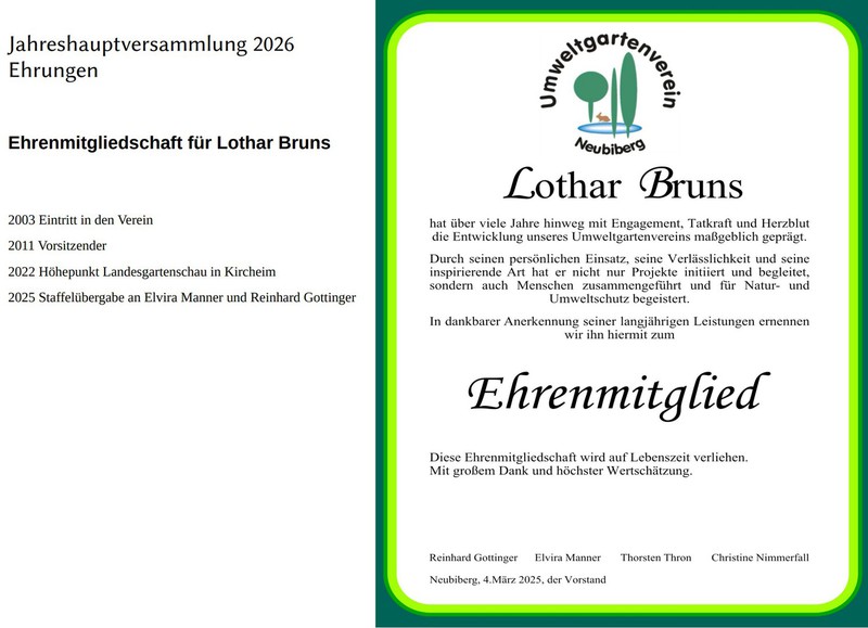 Lothar Bruns hat über viele Jahre hinweg mit Engagement, Tatkraft und Herzblut die Entwicklung unseres Umweltgartenvereins maßgeblich geprägt. In dankbarer Anerkennung wurde ihm deshalb die Ehrenmitgliedschaft auf Lebenszeit verliehen.